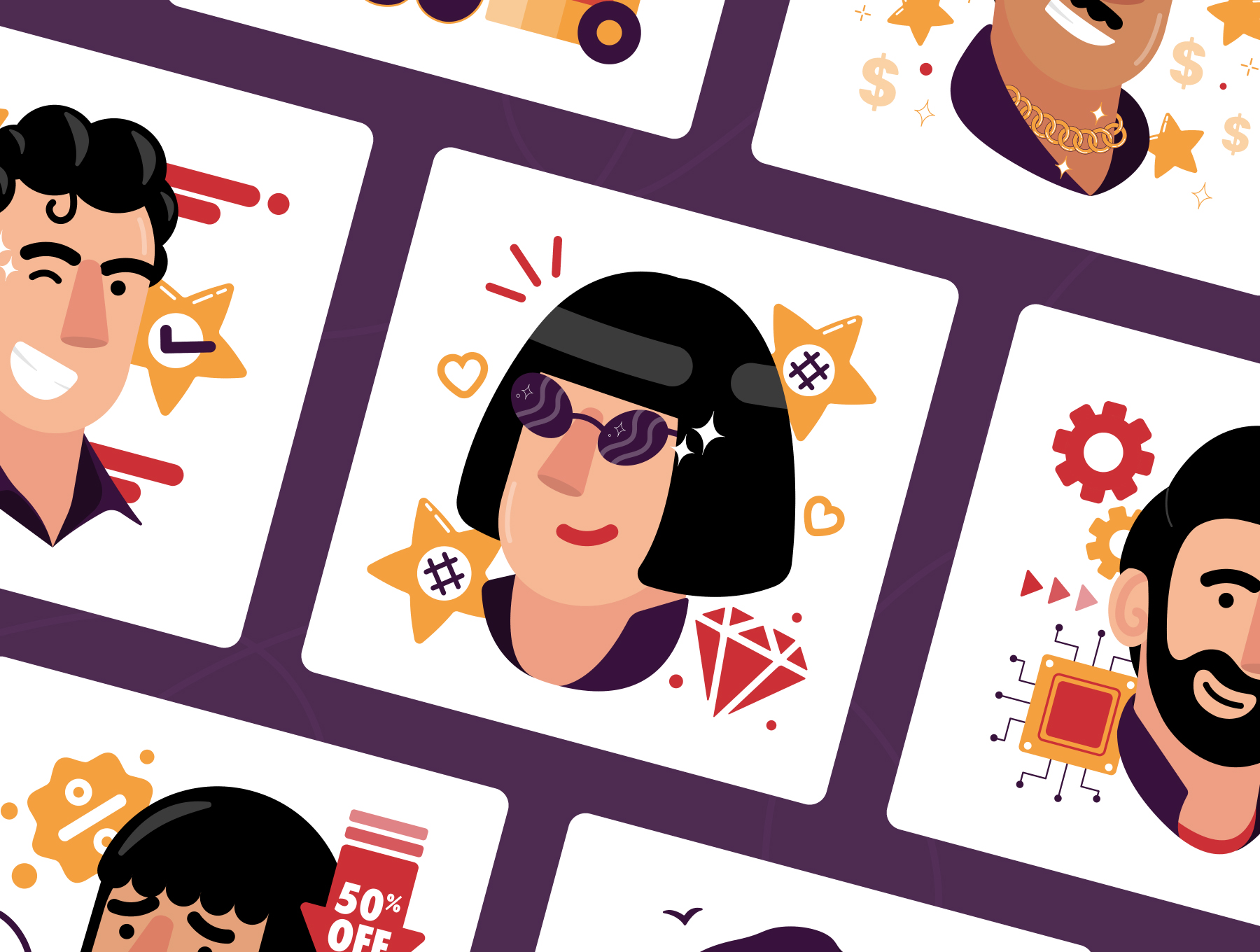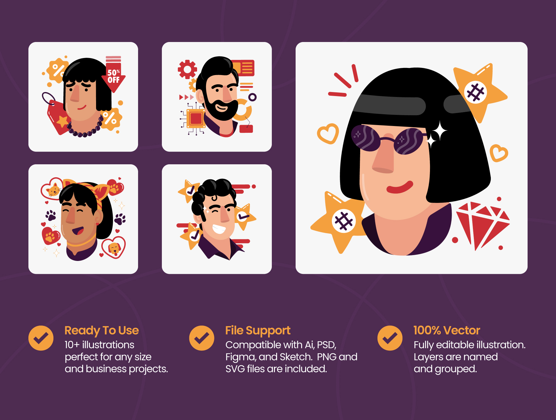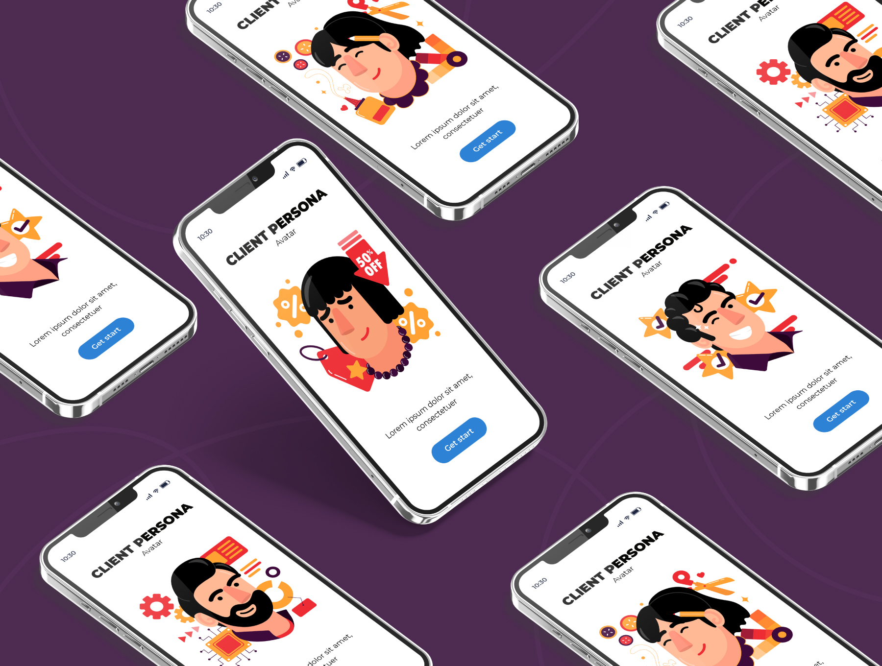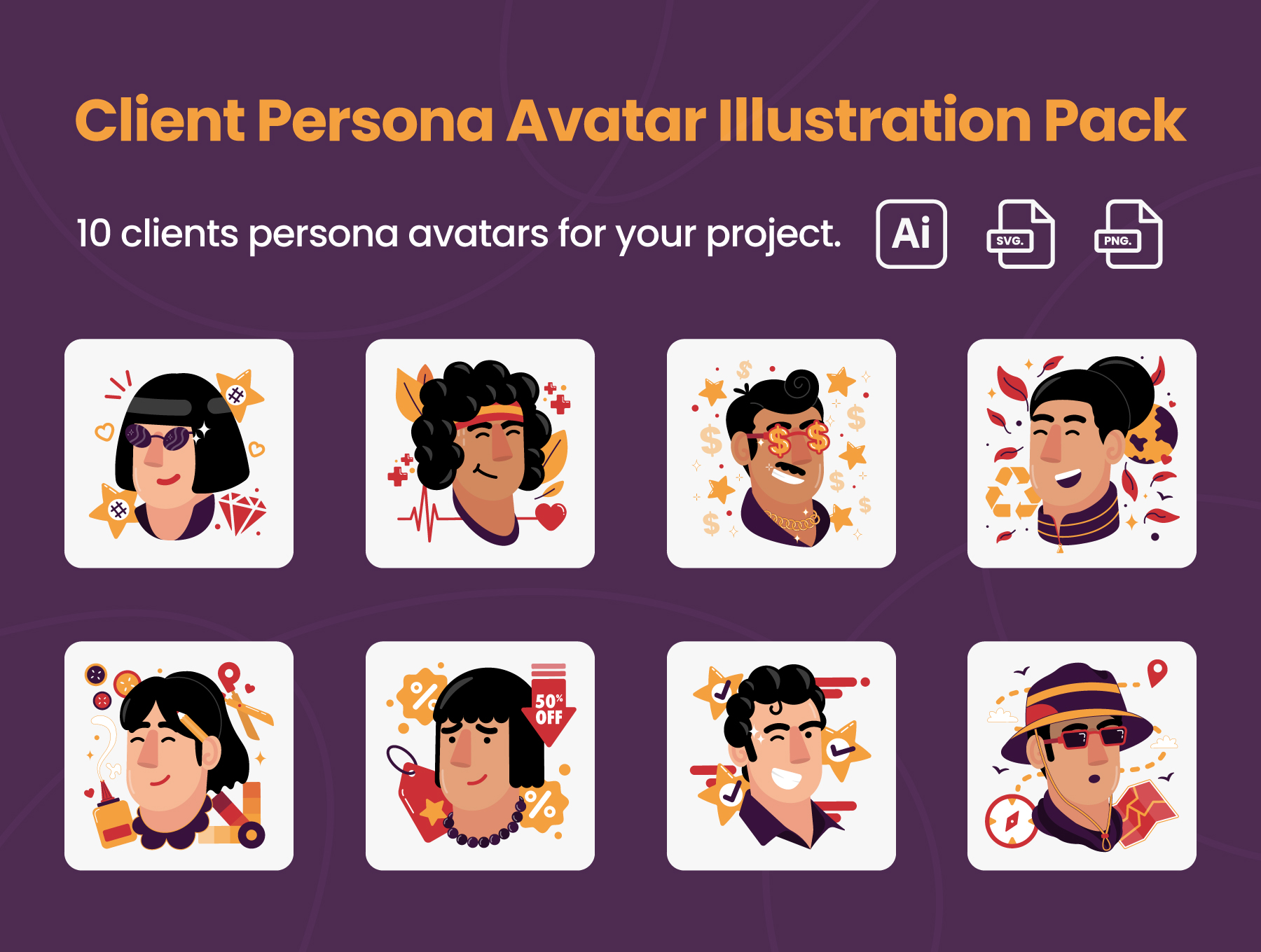 The client persona avatar illustration pack is a collection of high-quality illustrations that depict various client personas that a business or organization may encounter. Each illustration in the pack is carefully crafted to represent a specific type of client persona, with attention paid to their demographic characteristics, personality traits, and lifestyle habits. These illustrations are designed to be used in a variety of marketing materials, such as presentations, advertisements, and website content.